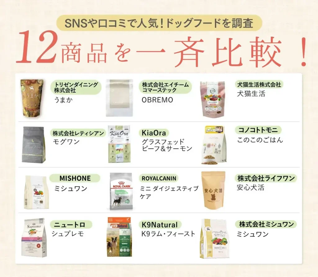 今回、私達はSNSや口コミなどで注目を集めている人気のドッグフード12商品を徹底調査しました!