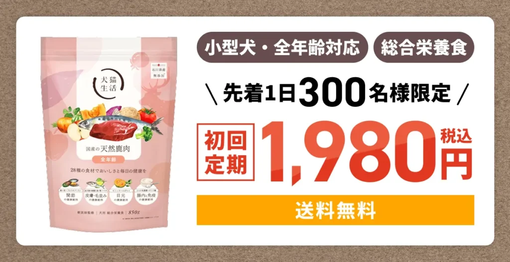 そんなこだわりのつまった「犬猫生活」は、まずは少量で試してわんちゃんの様子を見てもらいたいという思いから、初回限定1袋850g(約15日分)あたり1,980円(税込)。